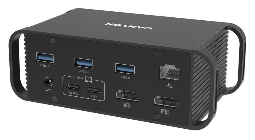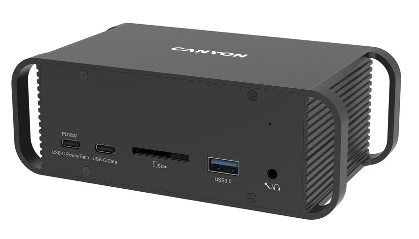 Canyon HDS-95ST is a Type-C multiport docking station. It provides up to 14 ports in a compact form factor. Just connect it via a twin Type-C cable to your laptop. The station has an improved heat dissipation system and provides Power Delivery to your laptop and phone without a single issue.